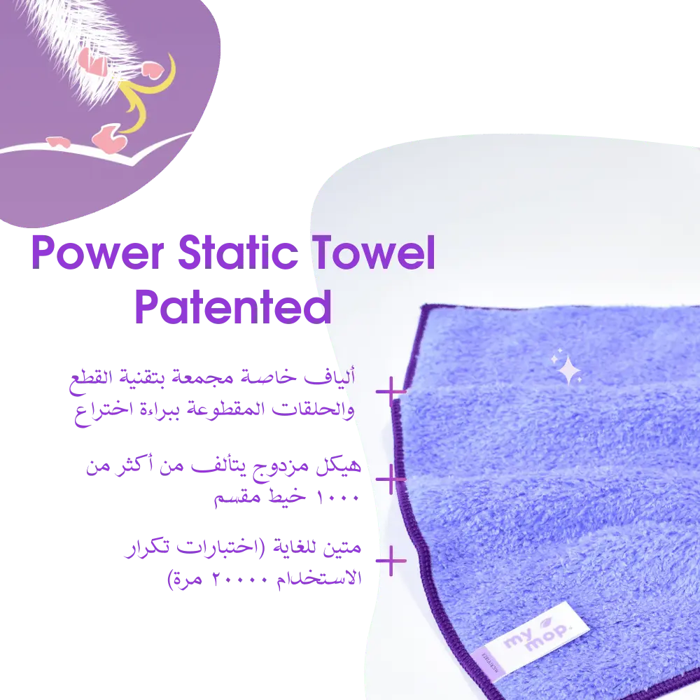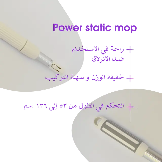Power Static Mop المبتكرة من My Mop والمطورة في كوريا، تمثل ثورة حقيقية في عالم التنظيف العصري، بتقنية الكهرباء الساكنة ورأس ممسحة يدور 360 درجة، تتيح لك هذه الممسحة تنظيفًا دقيقًا وفعالًا سواء جافًا أو رطبًا، ومزودة بمقبض تلسكوبي قابل للتعديل من 52 إلى 136 سم لتصل بسهولة لأصعب الزوايا وتحت الأثاث، كما تستخدم للحوائط والأسقف الجبس بورد، ويمكنها أيضًا تنظيف النوافذ الزجاجية العالية، خاصة وأنه يأتي معها Moof NanoFiber Pad بتقنية فائقة الامتصاص، تلتقط الغبار بدقة وتترك الأرض لامعة دون خطوط أو آثار، بينما اللون الموف الأنيق والتصميم الخفيف يجعلها مثالية لكل منزل يهتم بالنظافة والراحة.